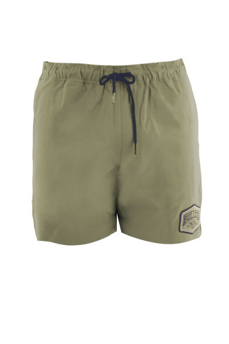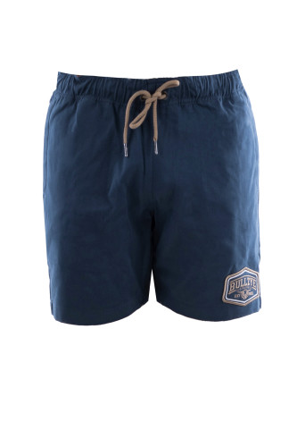 Heavy weight twill short with elasticated waist and contrast waistband facing, drawcord tie with metal ends, side welt pockets, jet pockets on back, Bullzye embroidery on back, large embroidered patch on front hem